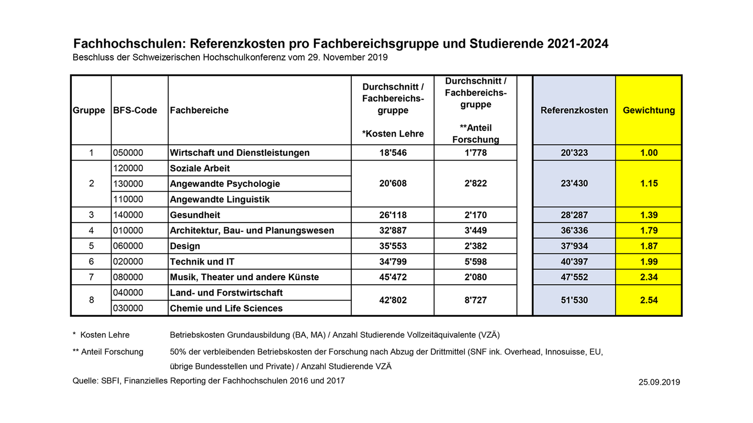 Die Plenarversammlung der SHK hat die Referenzkosten pro Fachbereichsgruppe und pro Studierenden für die kantonalen Universitäten und Fachhochschulen in der Periode 2021-24 wie folgt festgelegt: