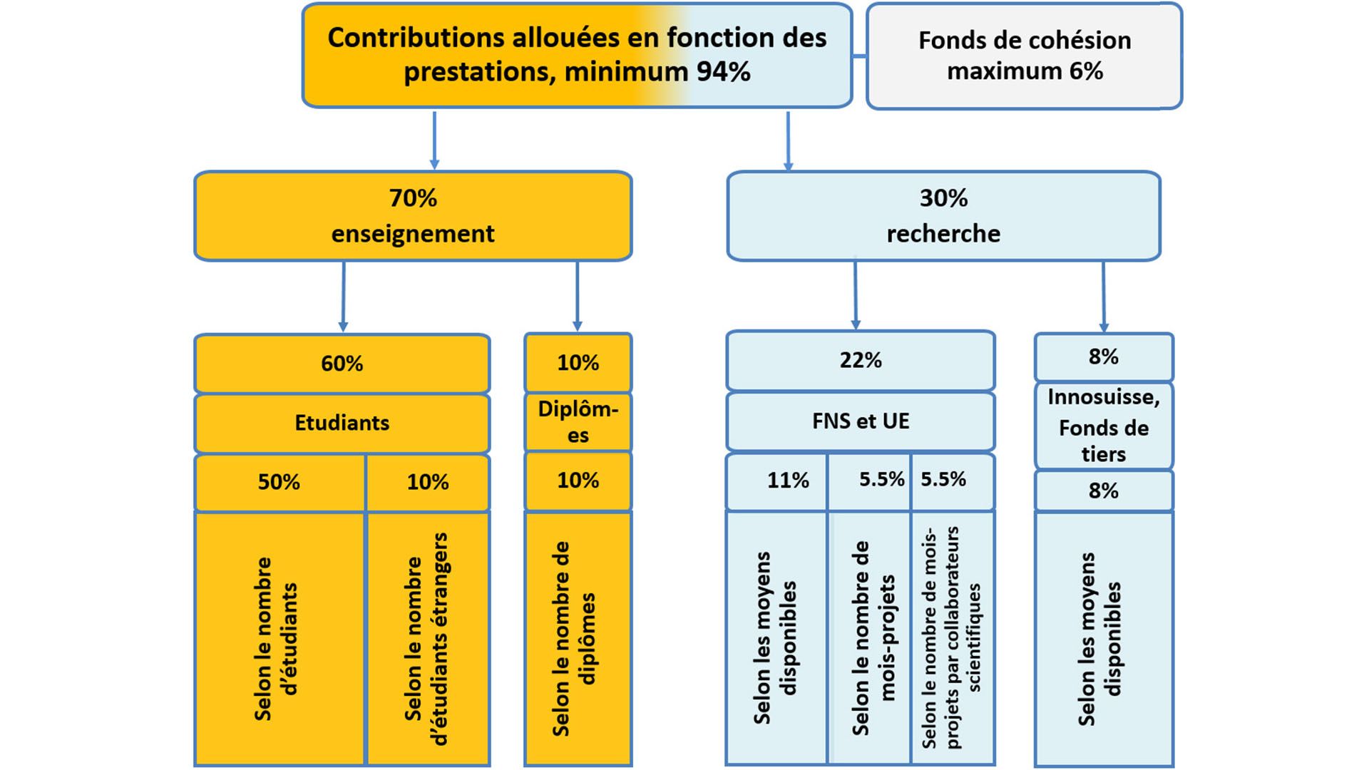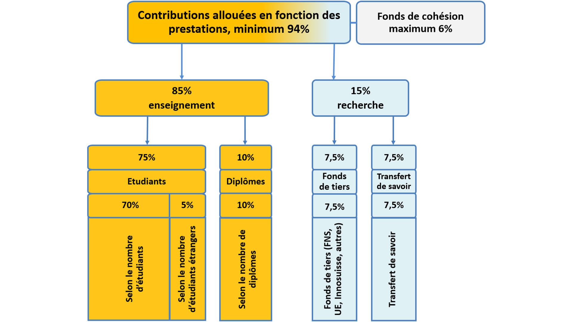 Par le message FRI quadriennal, le Conseil fédéral propose des plafonds de dépenses séparés pour les contributions de base en faveur des universités cantonales et des hautes écoles spécialisées; les Chambres fédérales les approuvent. Les contributions sont allouées en appliquant des critères de calcul fondés sur les prestations. Les prestations fournies par une haute école sont comparées à celles de toutes les autres hautes écoles du même type, et mises en concurrence. Compte tenu de l’objectif visant à assurer un financement de base, les charges des hautes écoles aussi sont prises en considération en plus des prestations fournies par ces dernières.