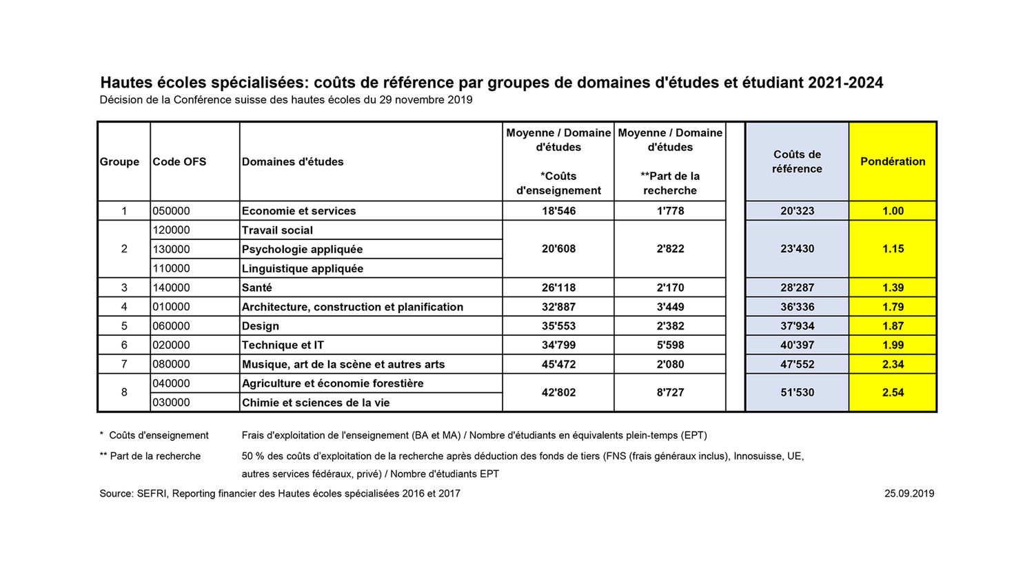 Hautes écoles spécialisées : calcul du monant total des coûts de référence 2021–2024
