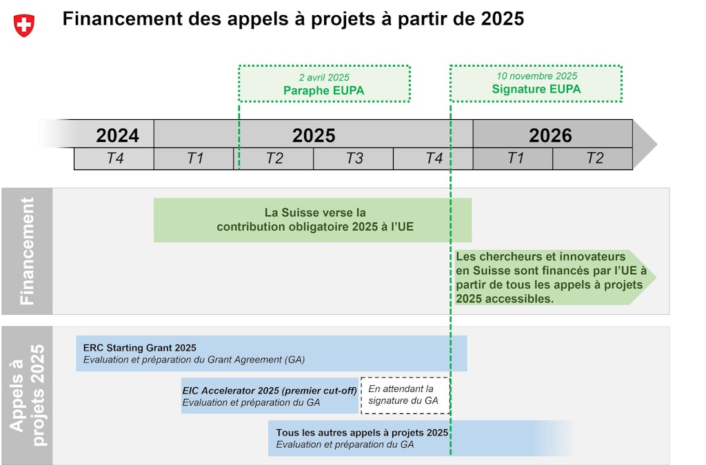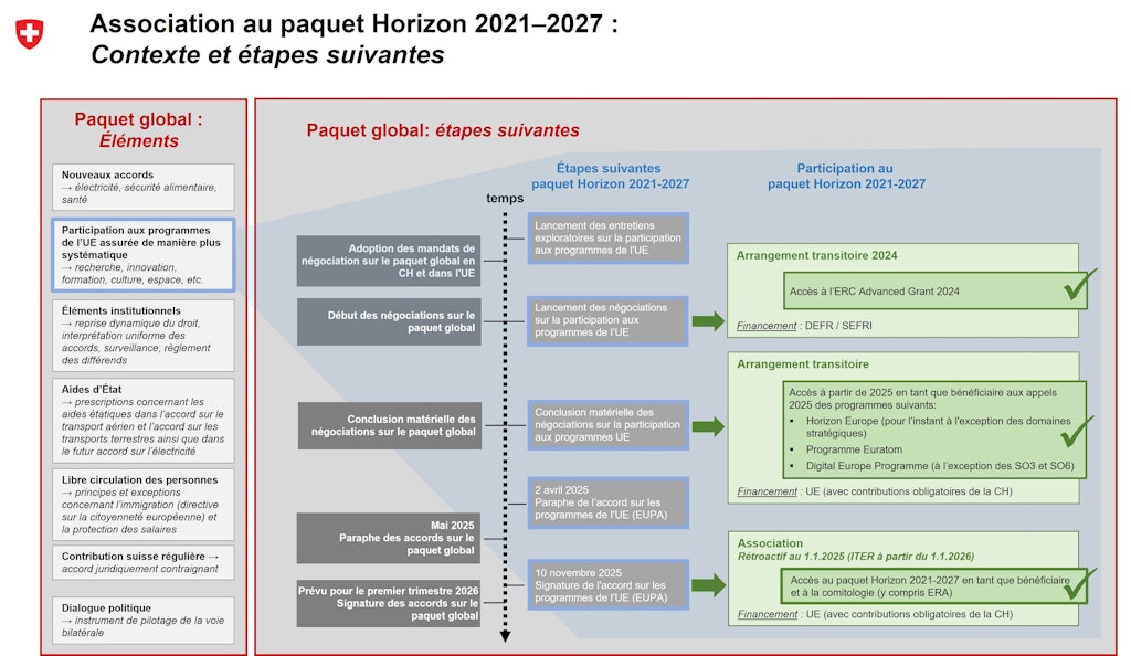 L'EUPA a été signé le 10 novembre 2025. Celui-ci s'applique immédiatement, ce qui signifie que la Suisse est associée rétroactivement à Horizon Europe, au programme Euratom et au DEP depuis le 1er janvier 2025, et qu'elle participera à ITER à partir du 1er janvier 2026. Le financement des projets est désormais assuré directement par la Commission européenne, la Suisse versant à cet effet une contribution obligatoire à l'UE. La signature de l’EUPA a lieu avant celle du paquet Suisse-UE, mais reste partie intégrale de ce paquet.