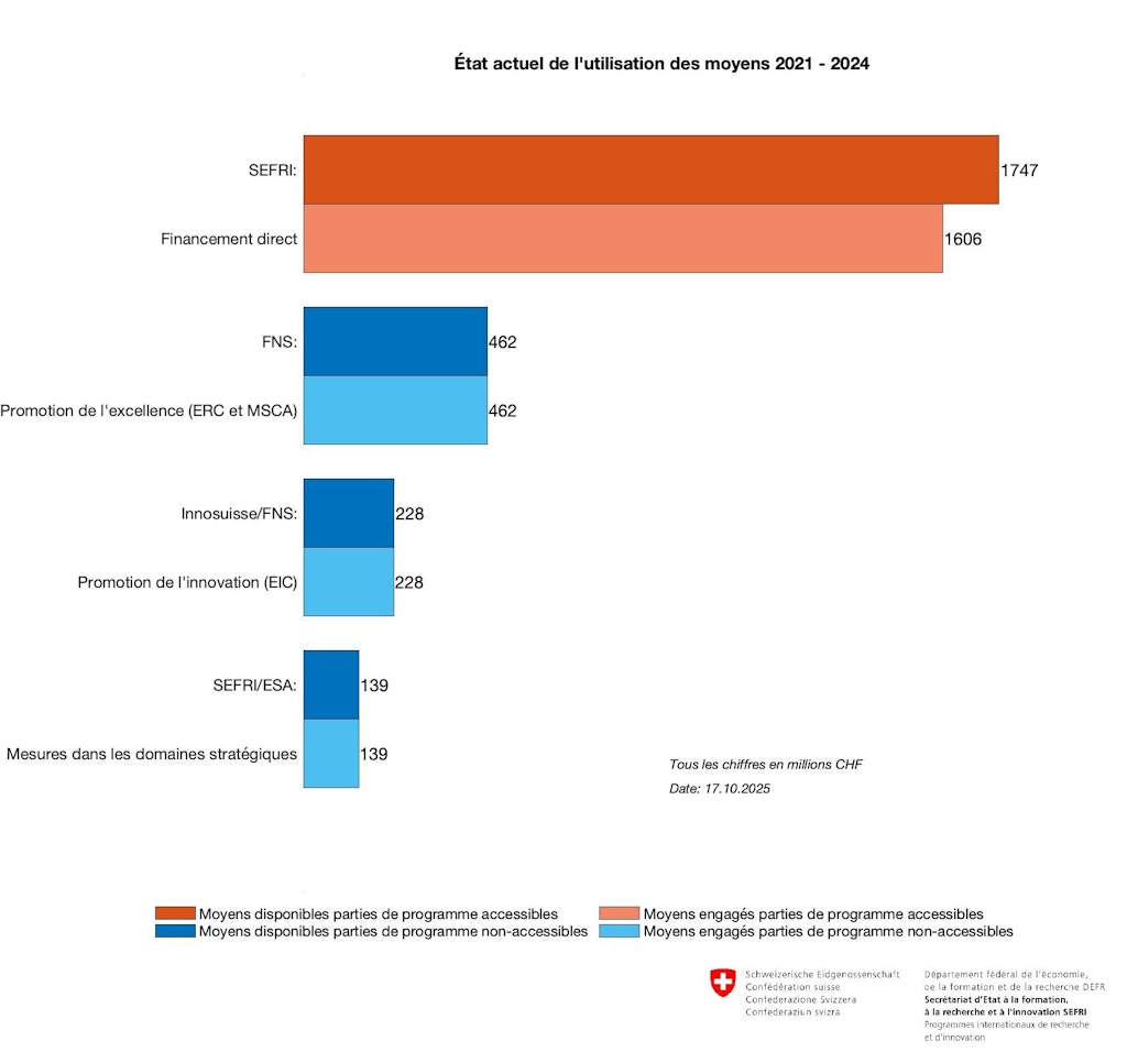 À ce jour (état le 17.10.2025), 2492 demandes de financement ont été déposées auprès du SEFRI. Sur ce total, 2269 projets ont déjà été approuvés. La figure ci-après présente l’état des moyens utilisés pour les années 2021 à 2024 et compare les moyens déjà alloués à des projets (moyens engagés) avec les montants maximaux prévus par le Conseil fédéral (moyens disponibles) pour les différentes mesures.