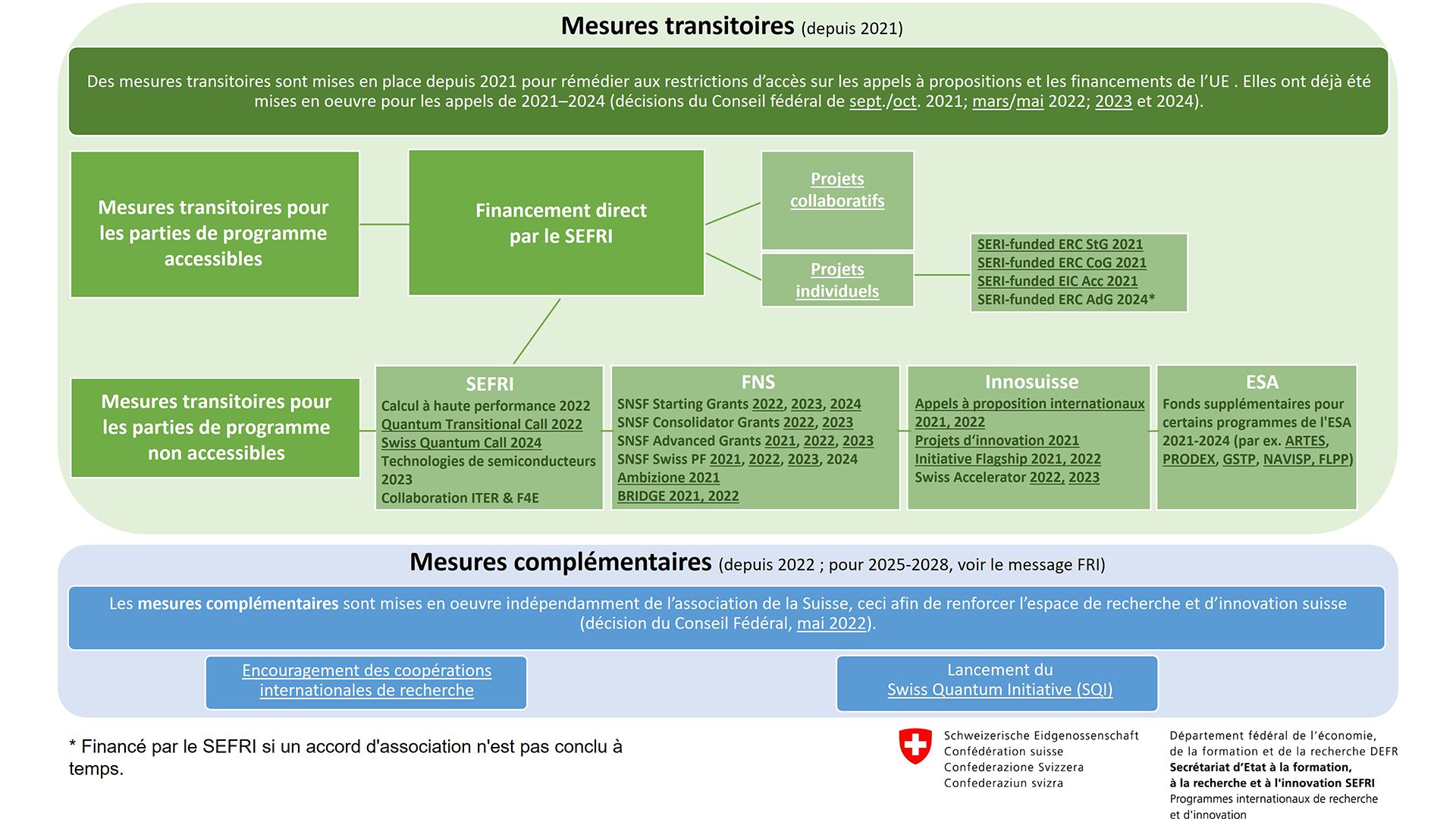 Afin d’atténuer les effets subis par la Suisse en conséquence de son statut de pays tiers dans le paquet Horizon, le Conseil fédéral a adopté une série de mesures transitoires pour les années 2021 à 2024. À cet effet, une enveloppe de 2,6 milliards de francs a été mise à disposition pour des versements directs du SEFRI aux participants à des projets ou des dépenses d’encouragement indirectes par le biais du Fonds national suisse (FNS), d’Innosuisse ou de l’Agence spatiale européenne (ESA).