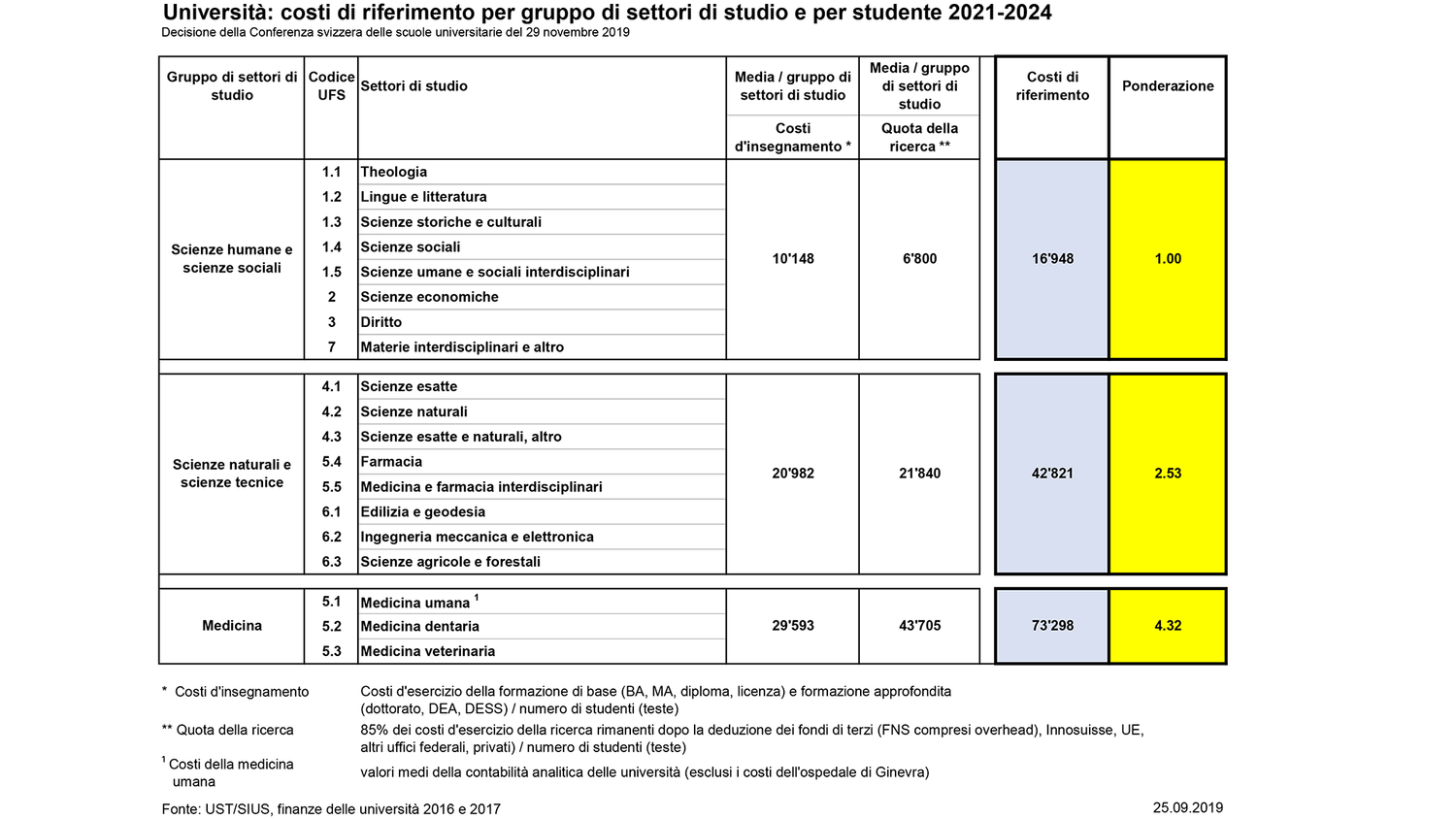 Per il 2021-2024, l’Assemblea plenaria della CSSU ha fissato i costi di riferimento per gruppo di settori di studio e per studente (università cantonali e SUP) come segue: