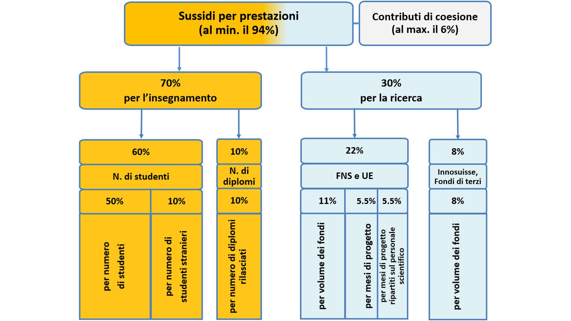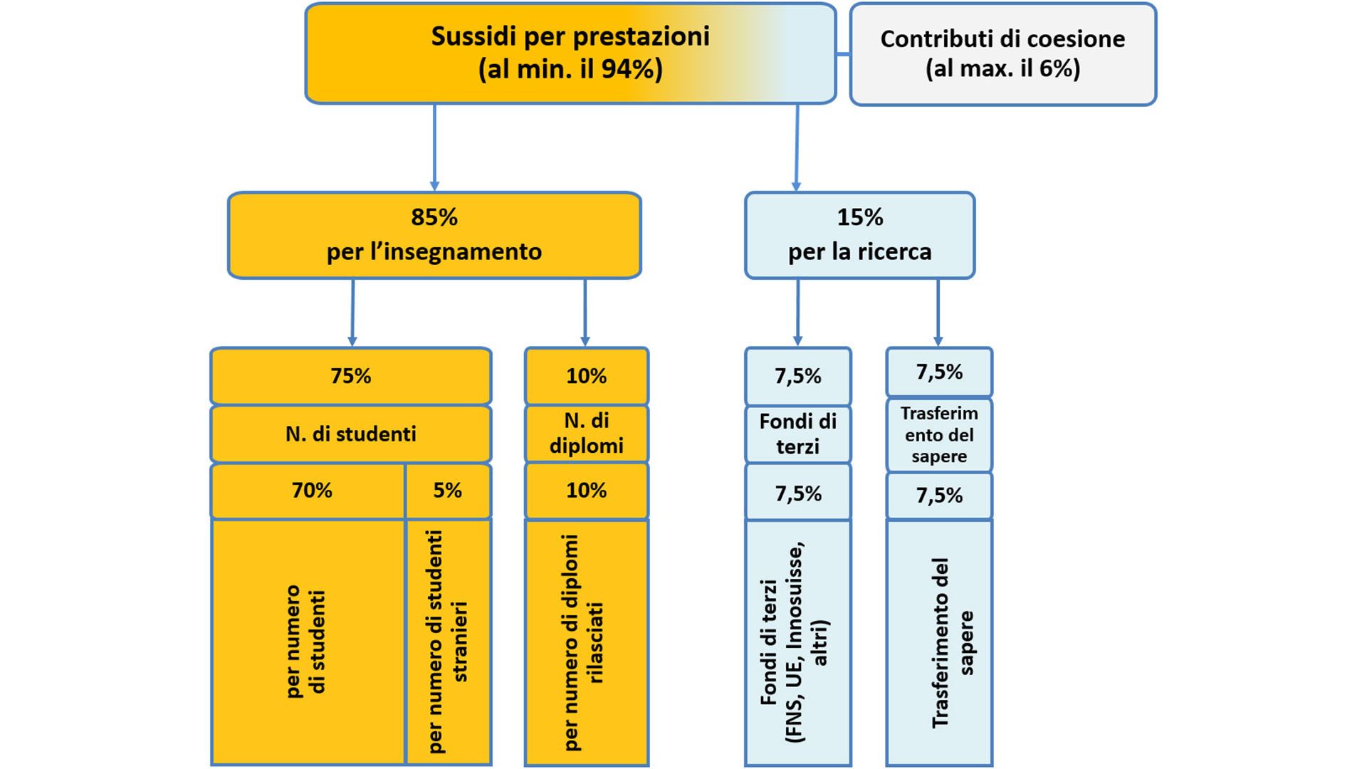 I sussidi per prestazioni fornite nell’ambito dell’insegnamento sono attribuiti alle scuole universitarie professionali da una parte sulla base del numero ponderato di studenti (70%) e del numero ponderato di studenti stranieri (5%) e, dall’altra, secondo il numero di diplomi (10%).
