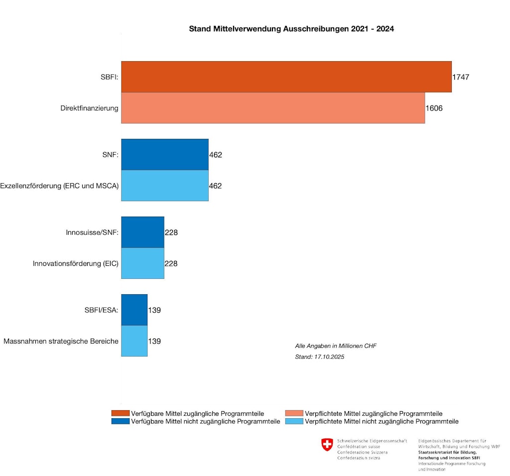 Beim SBFI sind bisher (Stand 17.10.2025) 2492 Finanzierungsgesuche eingegangen. Davon sind 2269 Projekte bereits bewilligt worden. Die nachstehende Grafik zeigt den Stand der Mittelverwendung für die Jahre 2021–2024 und stellt die bereits für Projekte gesprochen Mittel (verpflichtete Mittel) den vom Bundesrat für die einzelnen Massnahmen maximal zur Verfügung gestellten Mitteln (verfügbare Mittel) gegenüber.