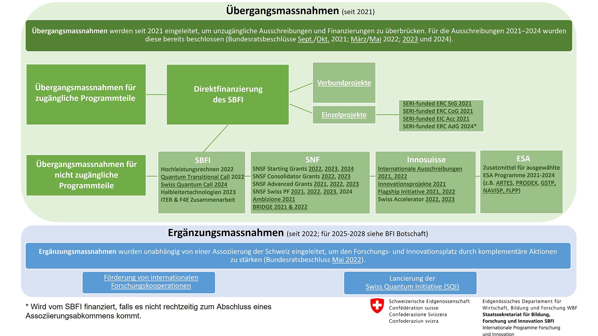 - Im Falle der Übergangsmassnahmen für nicht zugängliche Programmteile (in Blautönen), für die das SBFI den SNF, Innosuisse und die ESA beauftragt hat, erfolgt die Berichterstattung periodisch. Aus diesem Grund liegen die entsprechenden Zahlen noch nicht für alle Instrumente vor, obwohl die Massnahmen bereits eingeleitet sind.